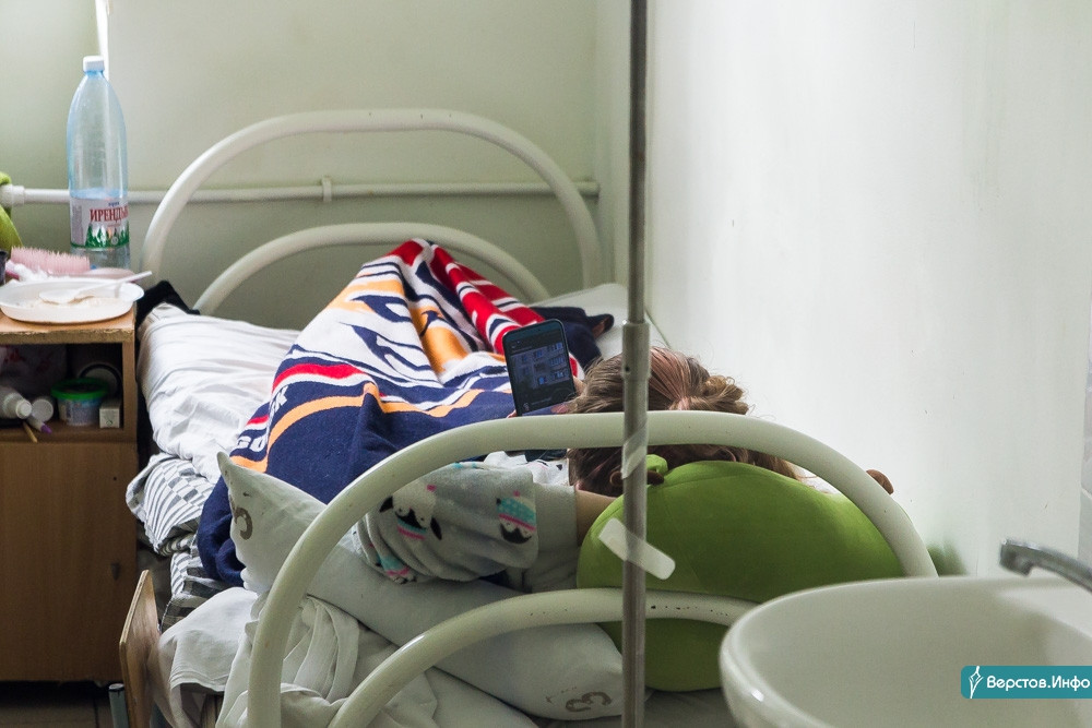 В блоке Б царит тишина, лишь из палат изредка доносятся голоса детей. Пациенты в основном либо спят, либо «сидят» в соцсетях в телефонах. В конце блока открыт запасной выход, куда некоторые больные выходят подышать свежим воздухом…